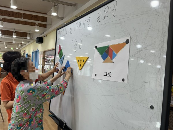 칠교놀이는 7가지의 도형으로 하나의 사물 등을 만들며 두뇌 회전에 도움이 되어