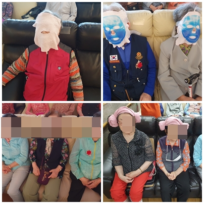 이 시간엔 건조해진 어르신들의 피부를 보호해 드리기 위해 마스크팩을 해드렸습니다.