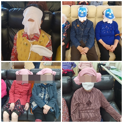 이 시간엔 건조해진 어르신들의 피부를 보호해 드리기 위해 마스크팩을 해드렸습니다.