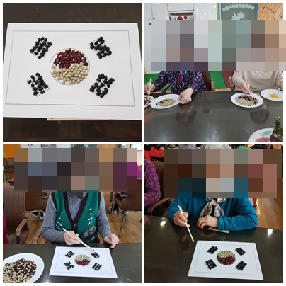 3종류의 콩을 분리를 해본 뒤 3.1절을 맞아 태극기가 프린트 되어진 워크북에 집중해서 콩을 옮겨보았습니다.