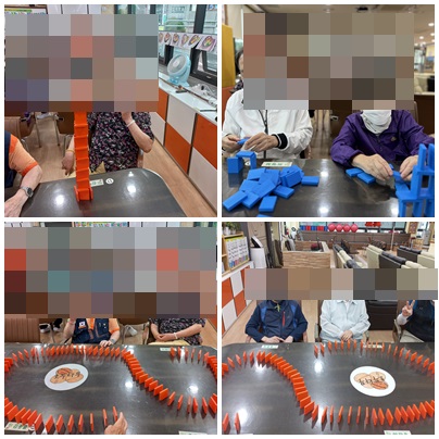 완성해보았습니다. 완성된 도미노를 어르신들께서 시원하게 쓰러뜨리고 환호성을 지르며 스트레스도 날아가는