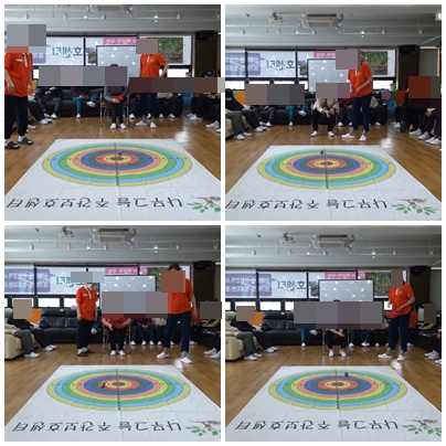 오늘 소개해드릴 신체활동은 오자미게임입니다. 이 프로그램은 바닥에 펼쳐진 커다란 과녁판에