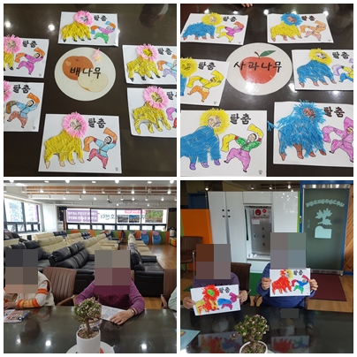예쁜색으로 채색을 하고 탈을 쓴 사자는 털실을 이용해 꾸며주는 프로그램입니다. 이 프로그램은 탈춤을 상상해서