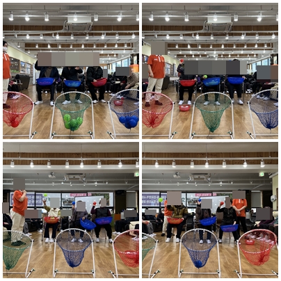 3개의 색깔이 표시된 골대에 같은 색의 공을 던져 넣어보는 활동으로 어깨의 회전근과,