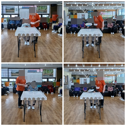 부채로 바람을 일으켜 예쁘게 꾸며진 우드락 볼을 점수가 있는 컵 안에 넣는 활동을 진행해 보았습니다.