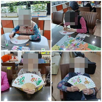 매화나무, 대나무, 국화, 모란, 나비, 연꽃 등의 그림이 그려진 부채에 어르신들께서 정성스럽게 색칠을 하셨습니다.