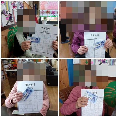 토요일 오후 인지활동 프로그램으로 빙고 게임을 진행하였습니다. 빙고게임은 총 2차로 진행되어집니다. 1~50빙고(1차)와 1~75빙고(2차)를 진행하는데 한줄을 먼저 완성시키는 줄빙고와 모든 숫자를 모두 동그라미해야 외칠 수 있는 완빙고로 이루어집니다. 이 프로그램은 어르신들께서 숫자를 빙고종이에 작성하시는 과정에서 기억력향상과 수 인지기능에 도움이 되며 사회자가 불러주는 숫자를 귀 기울여 들어야 하기 때문에 집중력향상에 아주 좋은 프로그램입니다. 우리 어르신들 빙고를 행해 집중하셔서 숫자를 써내려 가셨습니다. 오늘 빙고 되신 어르신들 모두 축하드립니다.