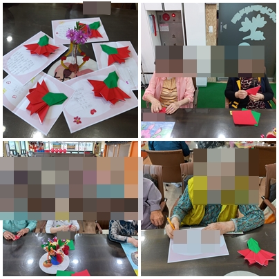 붉은 색종이와 초록색 색종이 편지지를 어르신들게 나눠드렸습니다. 붉은색 색종이와 초록색 색종이를