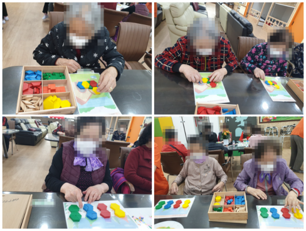 도안에 맞는 모양을 맞추기 위해 블럭을 사용해 어르신들께서 고민하시며 하나하나 맞춰보았습니다.