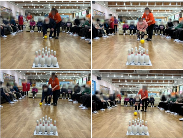 10개의 볼링핀을 맞추기 위해 어르신들께서도 집중력을 높여 공을 굴리는 게임입니다.