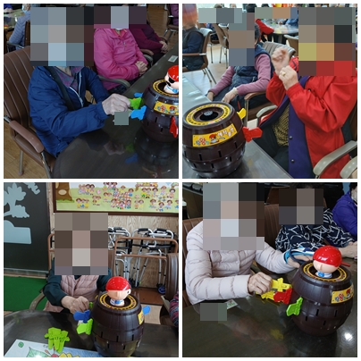 귀엽게 생긴 해적이 있는 룰렛 게임으로 통 안쪽 가운데 직접 칼을 꽂아 해적이 튀어나오지 않도록 고민하는 과정에서 사고력도 발달시킬 수 있는 프로그램입니다. 각 테이블 마다 해적룰렛과 칼을 준비해 드리고, 어르신들은 순서대로 조심스럽게 통안에 칼을 꽂아 보셨습니다. 칼을 꽂고 해적이 튀어나오는 순간에는 깜짝 놀라며 크게 웃으시는 모습이 정말 인상적이었습니다. 어르신들은 조마조마한 마음으로 서로 응원하며 함께 게임을 즐기셨습니다.
