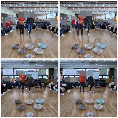 어르신들께서 발등에 올린 오자미를 숫자 바구니를 향해 힘껏 차며,