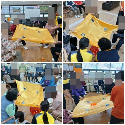 제한 시간 안에 높은 점수를 얻기 위해 네 분의 어르신들이 힘을 모아 도전하셨고,게임 전에는 작전도 짜보시고, 진행 중에는 손 대신 몸을 흔들며 유쾌하게 참여하셨습니다.