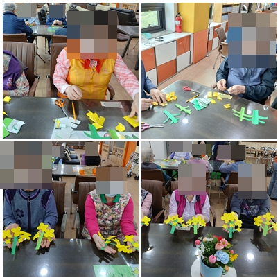 5월 초에서 중순은 유채꽃이 활짝 피는 시기로, 어르신들과 함께 색종이를 이용하여 유채꽃 만들기를 해보았습니다.