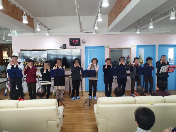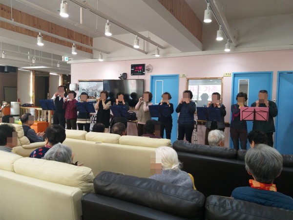 저희 나무그늘 어르신들을 위해서 화정실버봉사단 하모니카 연주팀이 오셔서 아주 감미롭고 흥이 넘치는 연주를 하셨습니다.