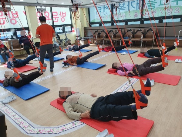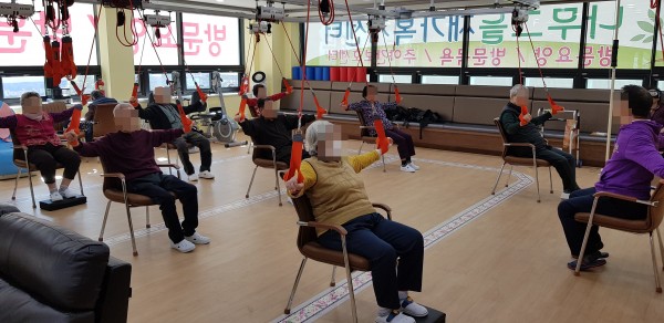 재활센터에서 어르신들이 선생님의 보조에 맞춰 슬링운동을 하십니다.