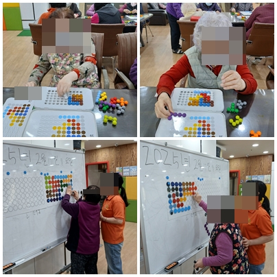 어르신들은 선생님이 보여주시는 구슬 퍼즐을 하나씩 꺼내어보시고 모양을 살펴보셨습니다.