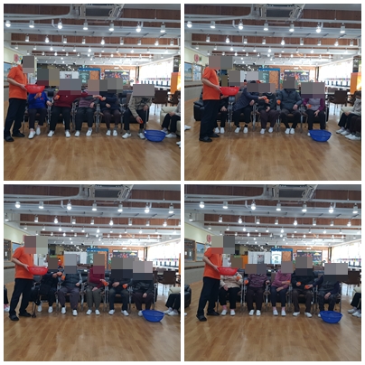 오늘은 5명의 어르신들께서 한 조가 되어 총 6팀을 이뤄 진행해보았습니다. 공을 옮겨보시고 협동하여 집중하셨습니다.