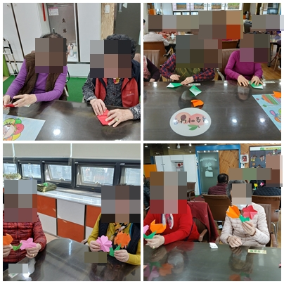어르신들에게 벚꽃과 튤립을 표현할 수 있는 다양한 형형색색의 색종이들을 나눠드렸습니다. 선생님의 설명을 집중해서 들으며 튤립의 꽃봉오리와, 줄기는 쉽게 접어보았고, 비교적 난이도가 있는 벚꽃은 어려워하셨으나 차근차근 설명을 드리고 보조해드리니 끝까지 접어보시며 완성해보셨습니다. 이 수업은 어르신들이 색종이 접고 자르고 붙이는 과정에서 손과 머리의 협응력 소근육 발달과 창의력 향상에 도움이 되며 완성된 작품을 통해 자존감이 향상될 수 있으며, 정서 안정에도 아주 좋은 프로그램입니다.
