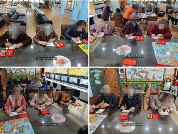 테두리 펜을 이용하여 반짝이 눈이 내리듯이 꾸며 보이시기도 하셨습니다. 어르신들은 진심을 다하여 가족들에게 편지도 쓰시고 행복한 오후 시간을 보내셨습니다.