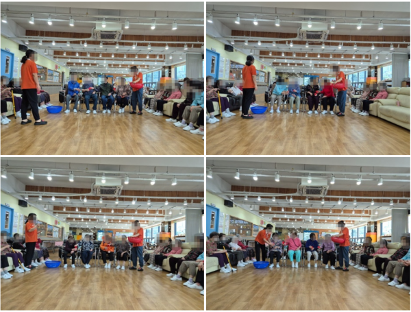 이 게임은 팀별로 진행되며 어르신들이 컵을 하나씩 들고